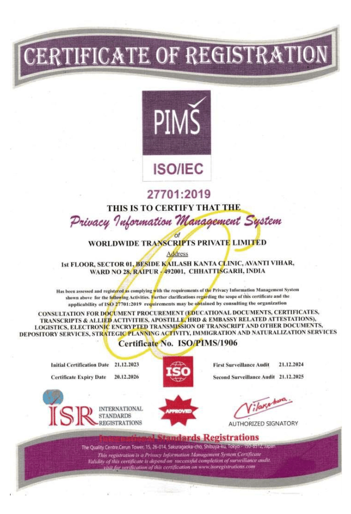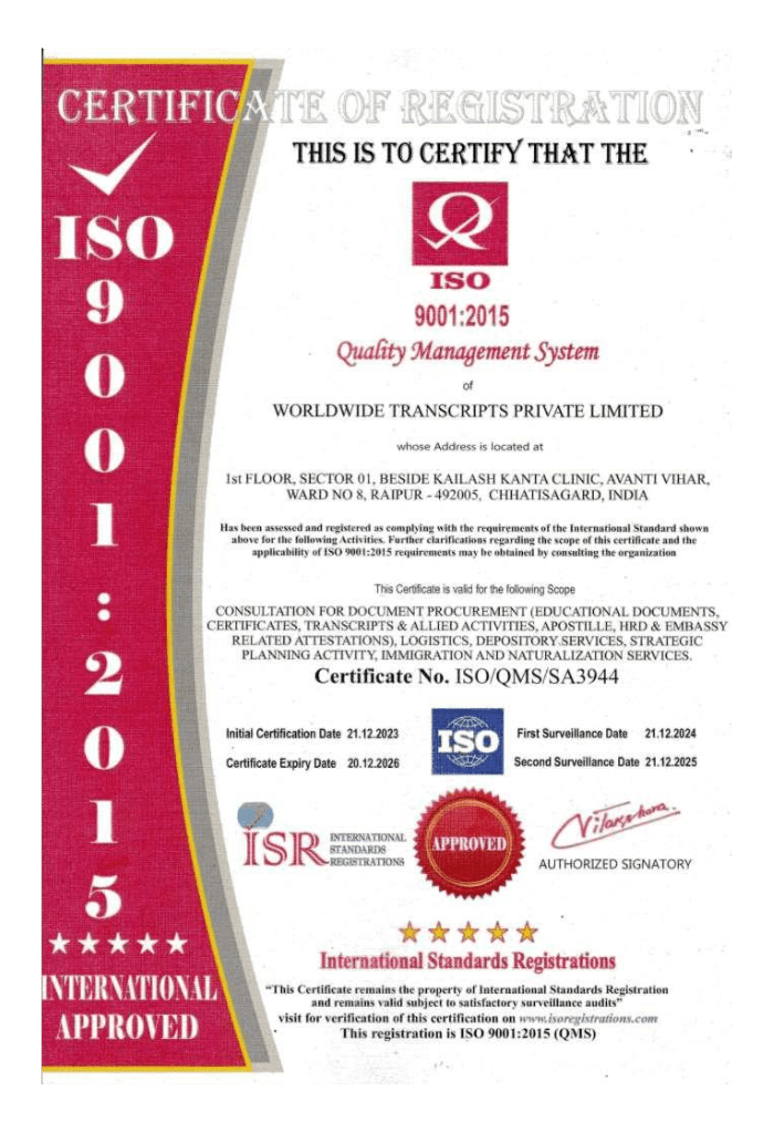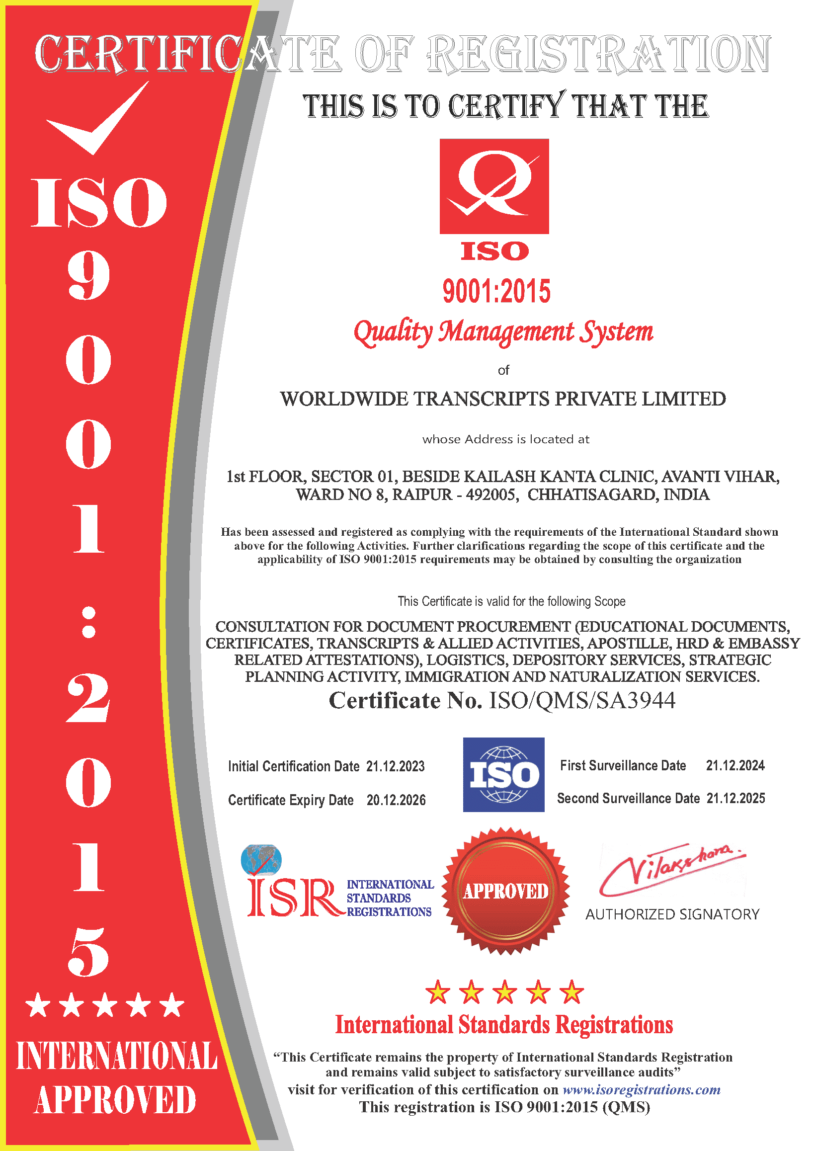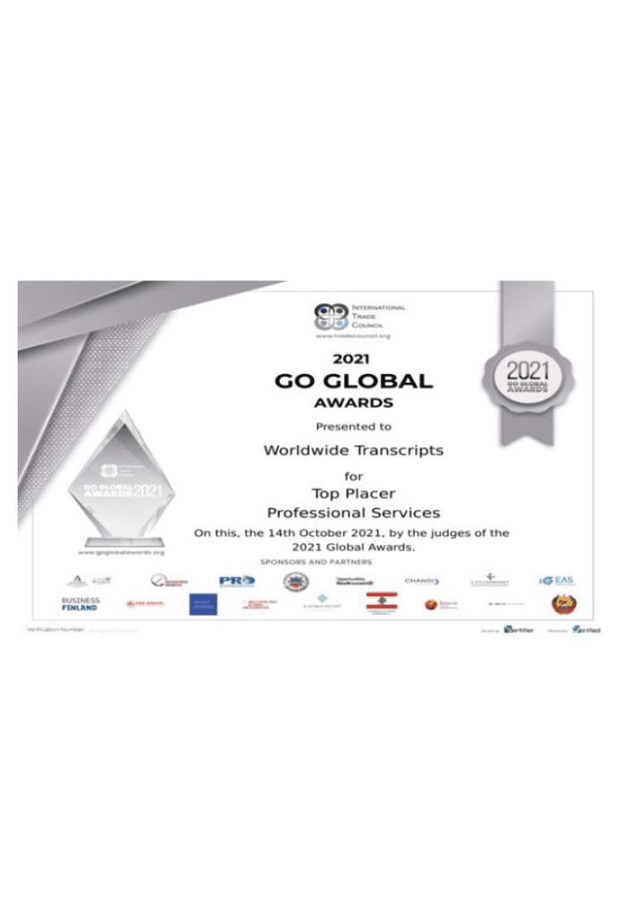 Worldwide Transcripts is a trusted and ISO certified organisation, ensuring quality management, encrypted digital transmissions, and compliance to Euro-GDPR privacy protection norms. We are also recognised with the ‘Go Global Award’ and the ‘People’s Choice Award’ in Canada, for our innovation, service excellence, and its effect on international immigration services.