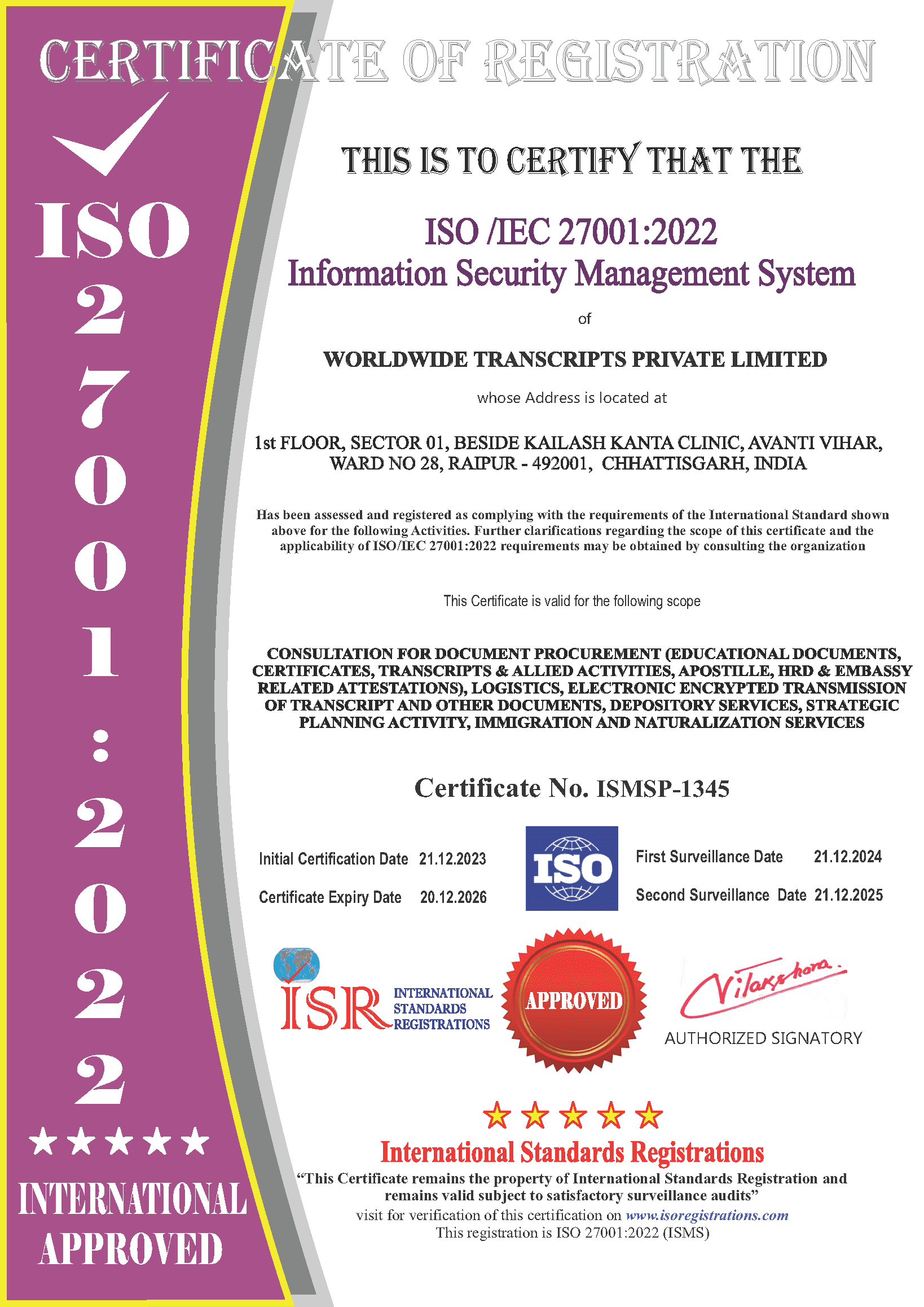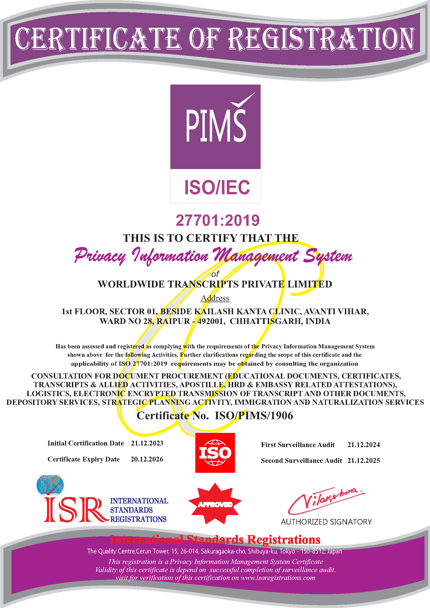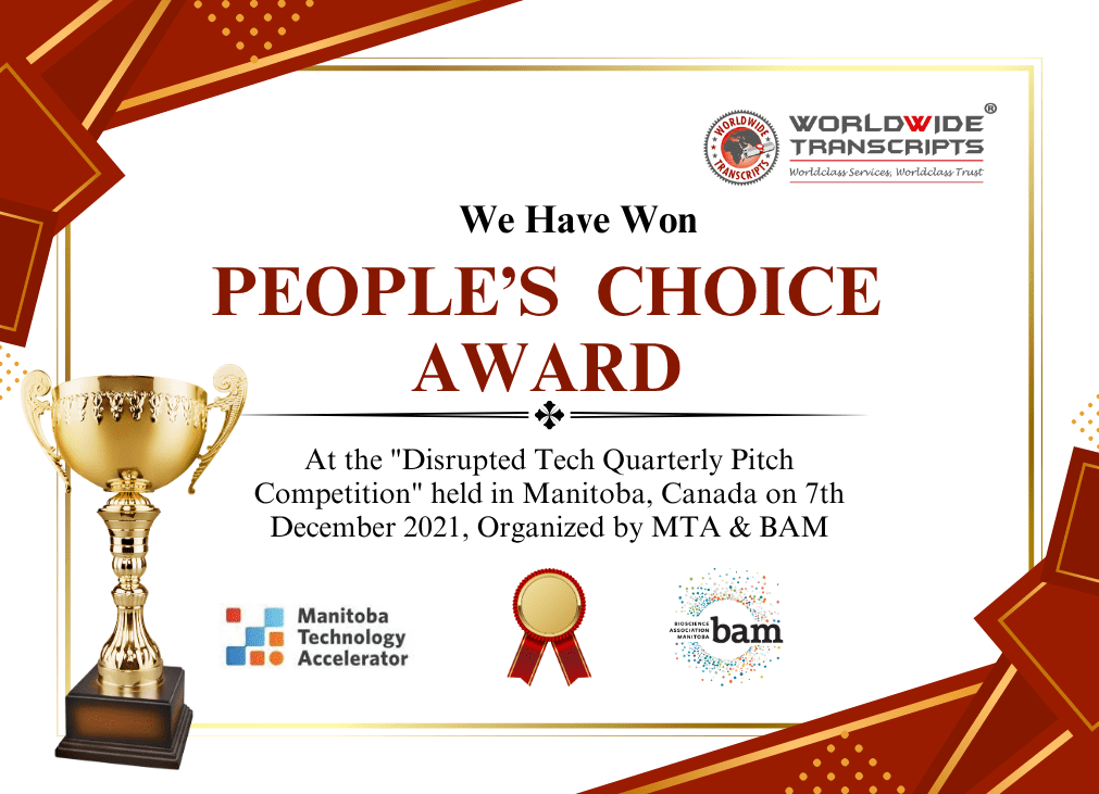 Worldwide Transcripts is a trusted and ISO certified organisation, ensuring quality management, encrypted digital transmissions, and compliance to Euro-GDPR privacy protection norms. We are also recognised with the ‘Go Global Award’ and the ‘People’s Choice Award’ in Canada, for our innovation, service excellence, and its effect on international immigration services.