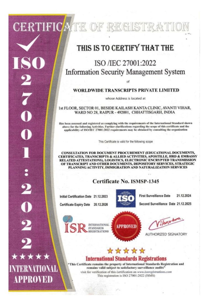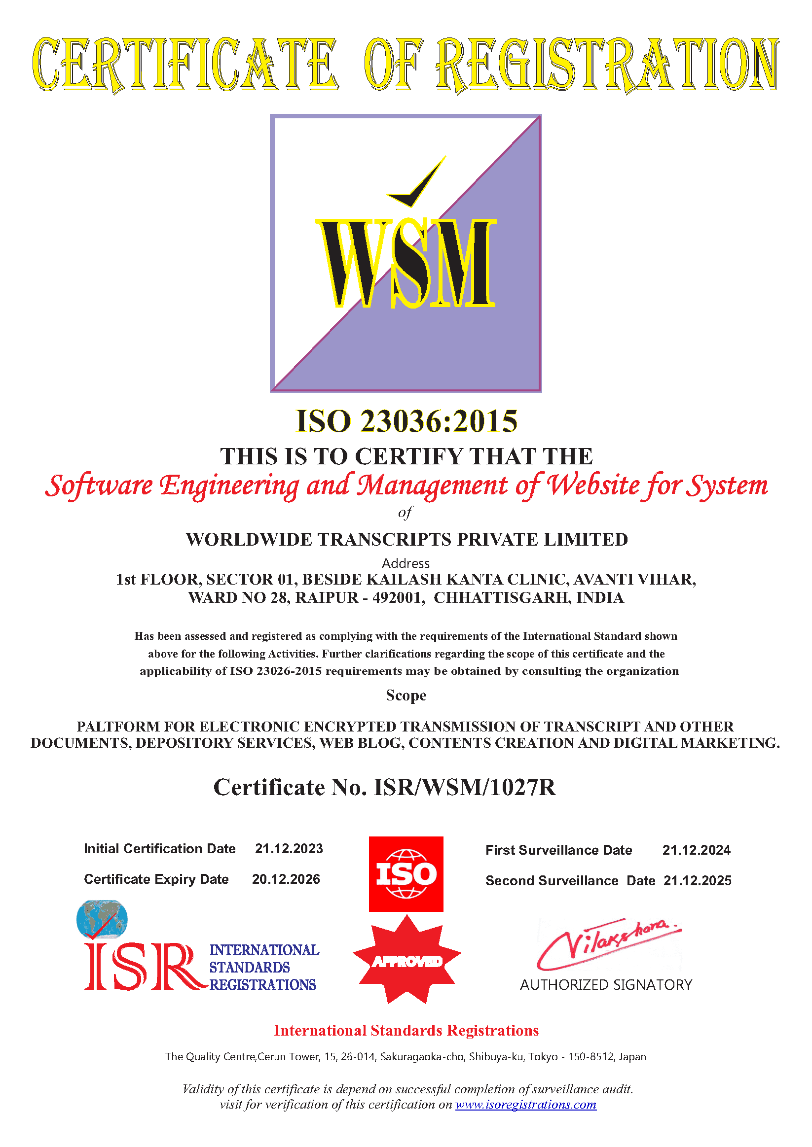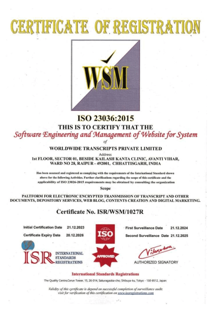 Worldwide Transcripts Pvt Ltd is the leading educational document procurement service provider with 15+ years of expertise. We take pride in procuring and timely delivering more than 175000 educational documents till date. We ensure efficient handling of your educational credentials, such as transcripts, degree certificates, and Apostille attestation. Using advanced technology, we focus on the secure and timely delivery of e-transcripts and educational documents worldwide