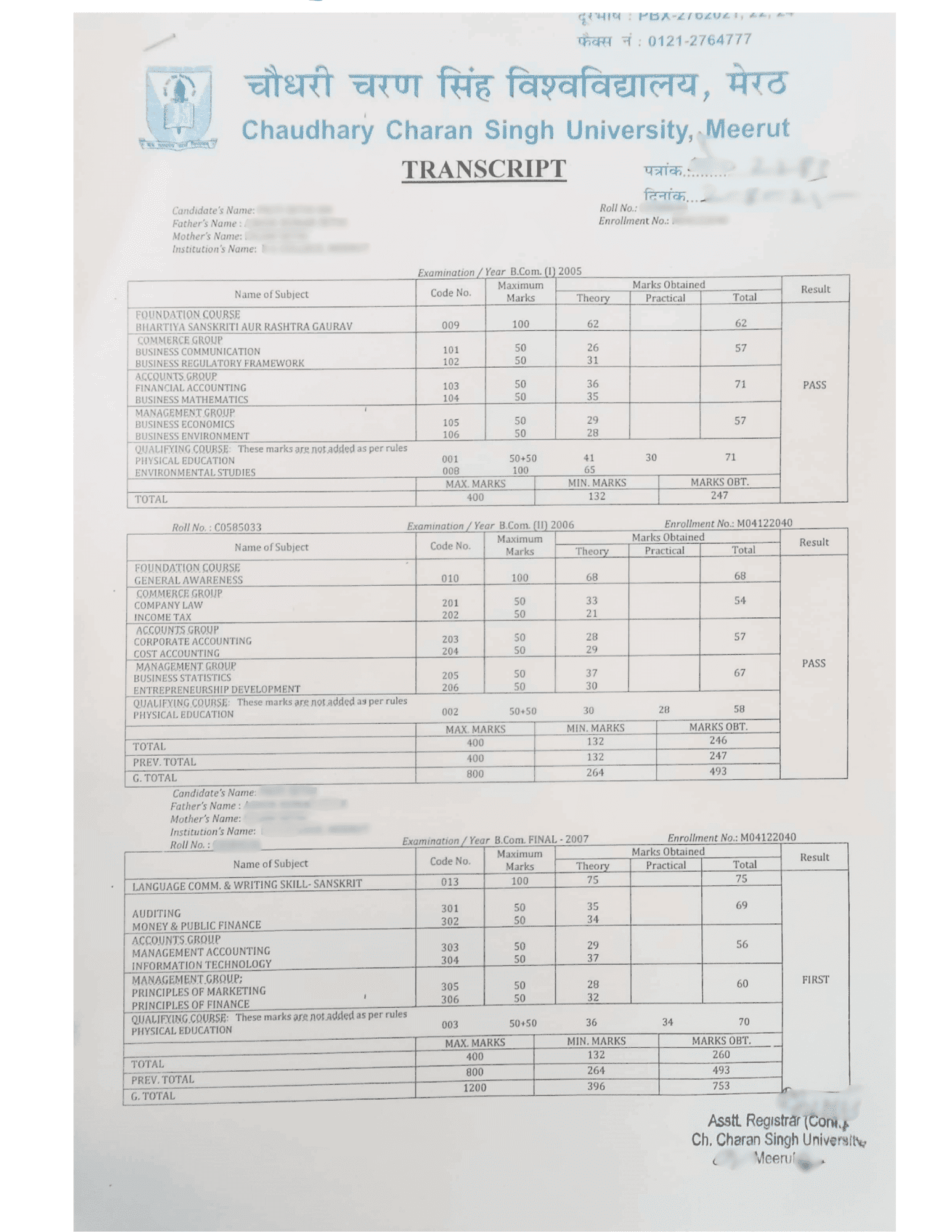 At Worldwide Transcripts we take care of your academic documentation needs so that you focus on your immigration goals. Once we get CCS, Merrut academic transcripts we will securely transmit the transcripts digitally to our affiliated ECA body for verification of credentials and assessment to generate evaluation reports such as GCE(2), ECE(3), CES(4) and IQAS(5) and other universities or academic institutions where it serves as an authoritative document for admission requirements for further studies or professional programs in just a click of a button guaranteeing prompt delivery and faster assessment.
