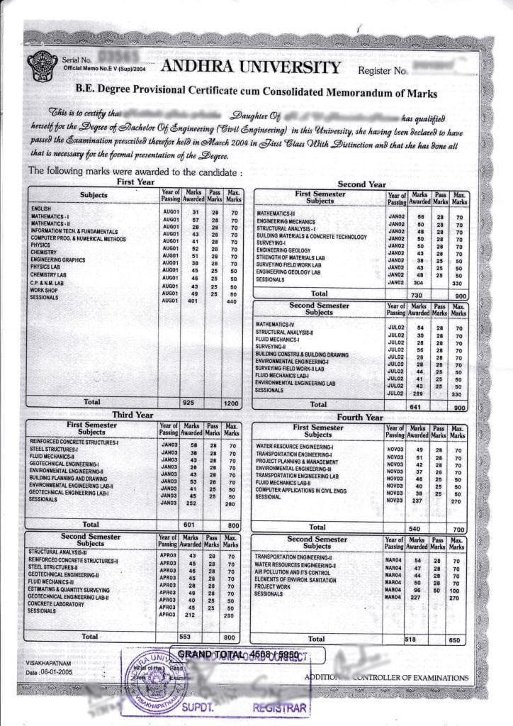 • Marksheets Your semester/year mark sheets issued by Andhra University/ affiliated college.